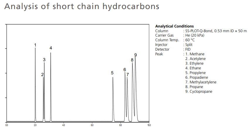 SS-PLOT-Q-Bond is a widely used column for the analysis of hydrocarbons and volatile organic solvents. Since a porous polymer (styrene divinylbenzene) is chemically bonded to the column, elution of polymer particles can be minimized. In addition, due to the high heat resistance of the polymer particles, it can be used at 320 °C and the polymer particles do not decompose. Furthermore, since the particle shape does not change due to water, the analysis of samples containing a large amount of water is also stable. A column with a particle trap column (SS-PLOT-Q-Bond-PT) is recommended when connected to an MS detector.