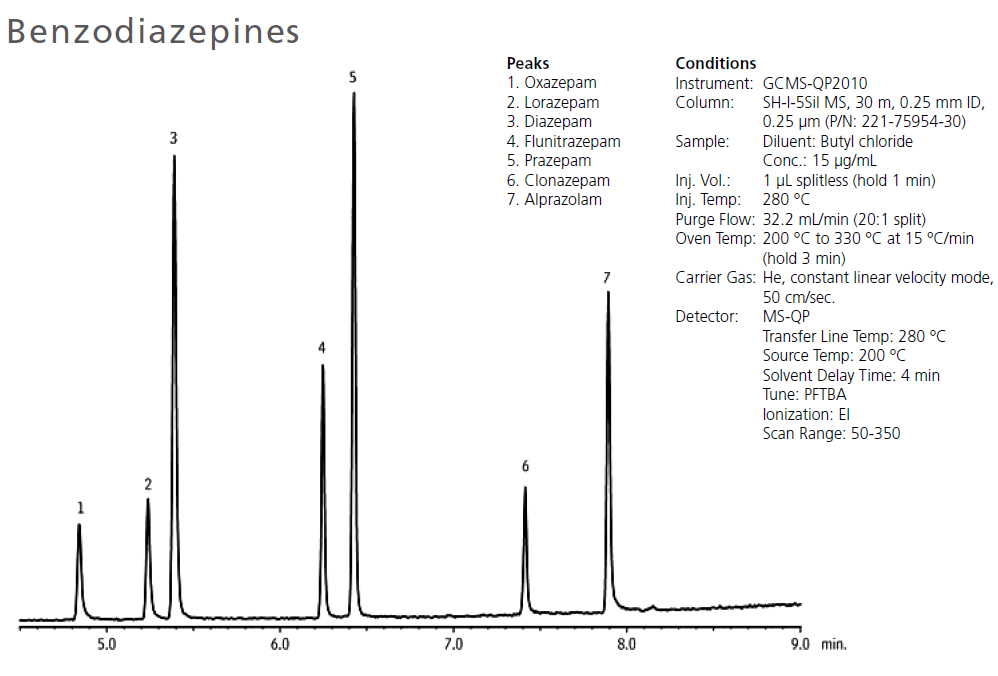 - General-purpose columns—ideal for GCMS analysis of semi-volatiles, polycyclic aromatic compounds, chlorinated hydrocarbons, phthalates, phenols, amines, organochlorine pesticides, organophosphorus pesticides, drugs, solvent impurities, and hydrocarbons.