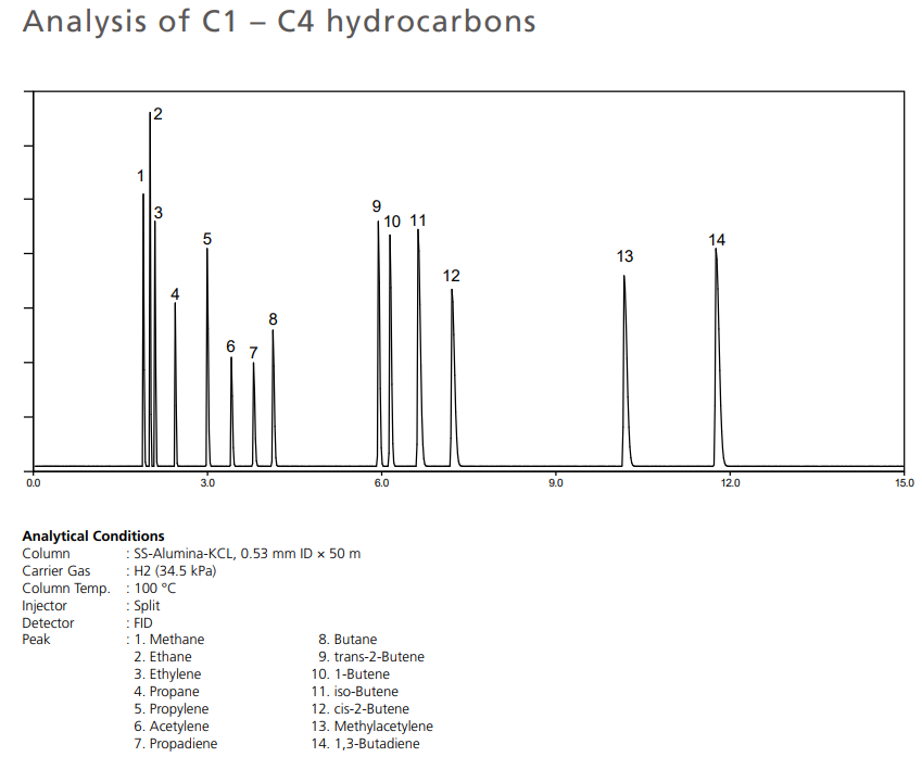 SS-Alumina-KCL has strong heat resistance, so, it can be used up to 200 °C and is capable of hydrocarbon analysis up to C10. In addition, it has excellent stability and minimizes the retention time fluctuation due to moisture. It shows high selectivity for C1 to C5 hydrocarbons at ppm level. Since the alumina oxide adsorbent is fixed to the inner wall of the column, there is no need to worry about particle exfoliation. A column with a particle trap column (SS-Alumina-KCL-PT) is recommended when connected to MS detector. SS-Alumina-KCL-UMetal uses inactivated metal capillary that are resistant to physical impact, making the column easier to handle than fused silica capillary column.