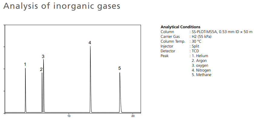 SS-PLOT-MS5A is a dedicated column for inorganic gas analysis. In conventional molecular sieve columns, the carbon monoxide (CO) peak is strongly retained due to adsorption and tailing is observed. In this column, the CO peak elutes quickly and the peak symmetry is very good. Good separation of argon and oxygen can be achieved even at room temperature. Since it is coated with molecular sieves, there is almost no particle exfoliation. When connected to an MS detector, a column with a particle trap column (SS-PLOT-MS5A-PT) is recommended. SS-PLOT-MS5A-UMetal uses inactivated metal capillary that are resistant to physical impact, making the column easier to handle than fused silica capillary column.