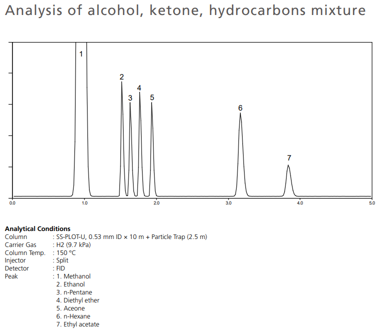 SS-PLOT-U is the most polar PLOT column and can be used for the analysis of polar compounds such as alcohols, ketones and halogens, organic solvents and non-polar compounds such as hydrocarbons up to C6 (especially C2 isomer analysis). Since it is hardly affected by moisture, the repeatability of the retention time is improved even for samples with high moisture content. Also, the peak of water itself can be obtained sharply, so it can be quantified.