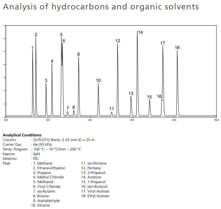 SS-PLOT-U-Bond is a PLOT column in which a highly polar polymer is chemically bonded to the inner wall of the column. It was developed for the analysis of highly polar volatile compounds. The chemically bonded PLOT column not only eliminates the risk of particle exfoliation, but also extends the maximum operating temperature to 300 °C, enabling hydrocarbon analysis up to C9. Bleeding at high temperatures can also be minimized, enabling stable and highly sensitive analysis.