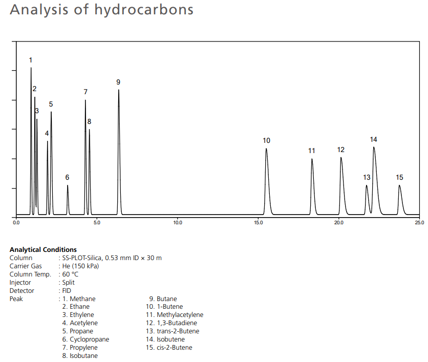 SS-PLOT-Silica is used for isomer analysis of hydrocarbons up to C4. In addition, since there is almost no effect of retention time due to moisture, it can be used stably even with sample gas containing a lot of moisture. In addition, sulfur gases such as H2S and COS can be also separated at the ppm level.