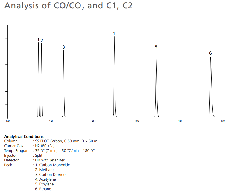 SS-PLOT-Carbon is an ideal column for the analysis of hydrocarbons in ethylene, (He, Xe, Ne, O2/Ar, N2, CO, CH4, CO2) in ethylene and propylene. The maximum operating temperature of SS-PLOT-Carbon has been extended to 300 °C. Therefore, high-boiling compounds can be eluted in a short time. Since it is not affected by water, the repeatability of the retention time is excellent.