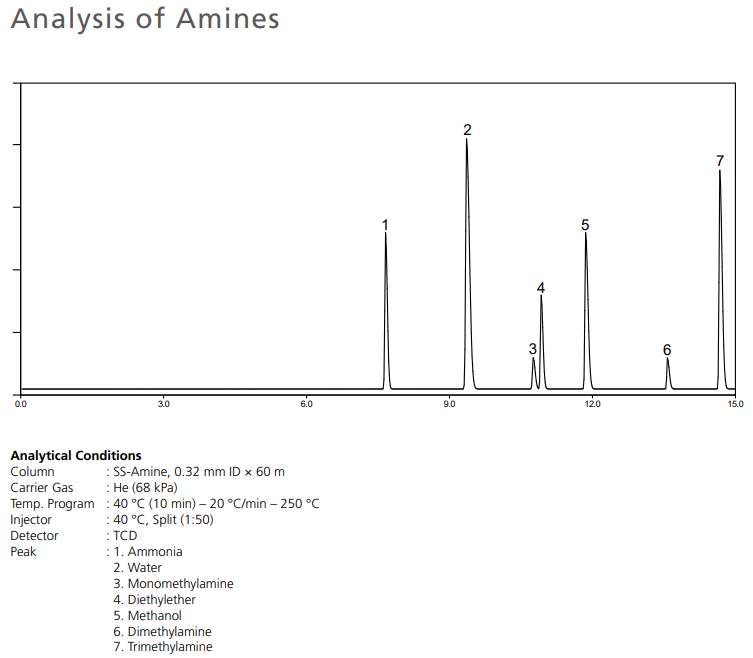 SS-Amine is a column developed for the analysis of volatile amines. This column is coated with a nonpolar stationary phase, and has high water resistance and excellent peak symmetry. The volatile amine can be analyzed stably even in the analysis of the sample containing much water. It is suitable for analysis of monomethylamine, dimethylamine and trimethylamine volatile amines and up to C10 amines.
