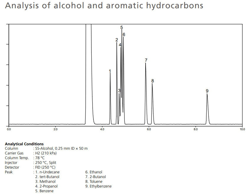 SS-Alcohol uses TCEP (1,2,3-tris [2-cyanoethoxy] propane) as a liquid phase and is a strong polar column developed for the analysis of alcohols and aromatic hydrocarbons in gasoline. Since methanol and benzene are eluted after C11, alcohol and aromatic hydrocarbons in gasoline can be easily separated.