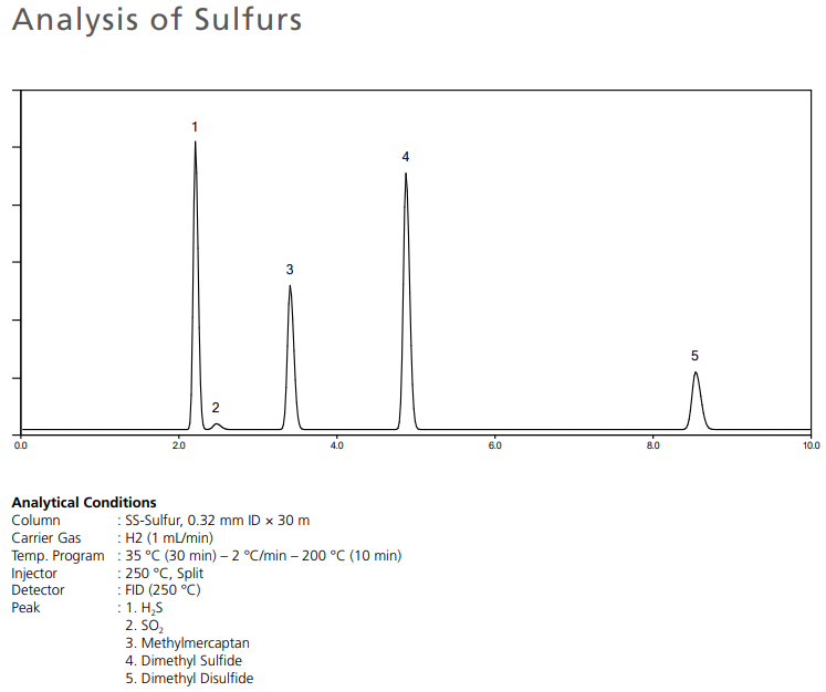 SS-Sulfur is a non-polar column developed for the analysis of volatile sulfur compounds. With sufficient inert treatment, it is possible to analyze SO2 as well as sulfur compounds up to C7 mercaptan.