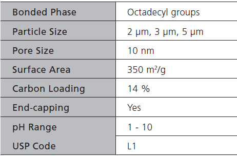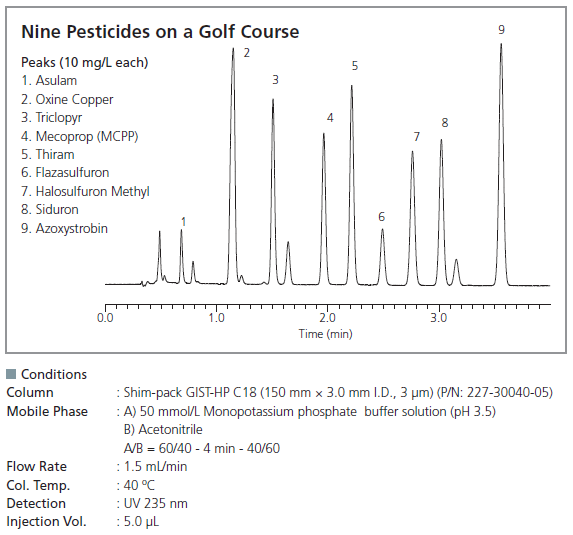 Furthermore, because of the new silica gel, Shim-pack GIST C18 is suitable for wider pH (1-10) analysis at a consistent performance. This enables use of a silica-based column under alkaline conditions.