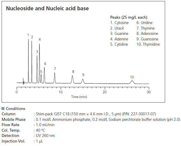 Shim-pack GIST C18 has superior inertness, which improves analysis precision and increases column stability. In addition, it can be used to analyze strong ionic compounds and difficult to absorb samples, which helps to obtain symmetrical peaks and high reproducibility.