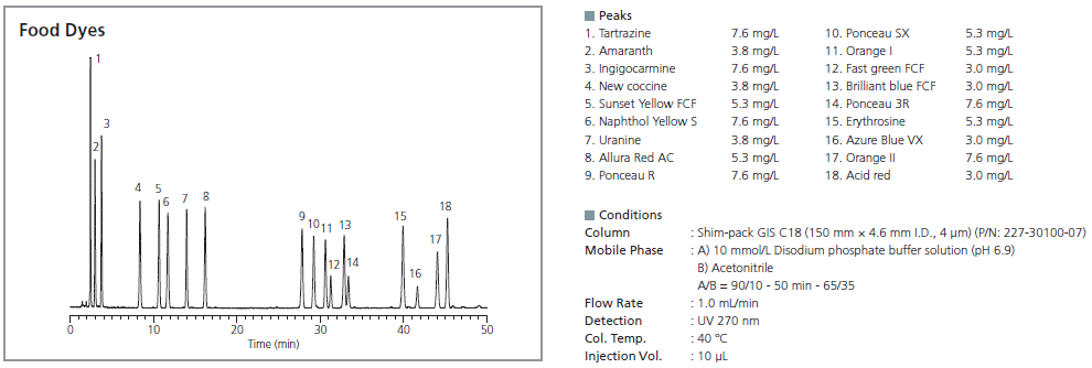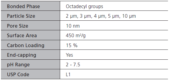 Widely used octadecyl bonded silica gel enables the Shim-pack GIS C18 to have strong hydrophobic interaction and low adsorption of ionic compounds. In addition, highly uniform particles ensure stable mobile phase delivery and outstanding low pressure.