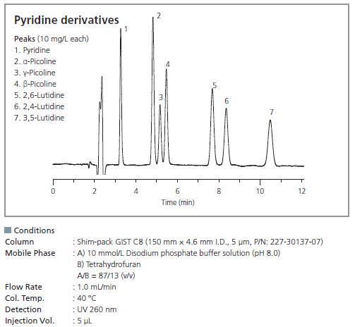 Shim-pack GIST C8 is packed with high-purity porous spherical silica for delivering the same extreme inertness to elute either basic or acidic compounds without undesired adsorption. Low retentivity and no sample adsorption enable analysis of natural samples.