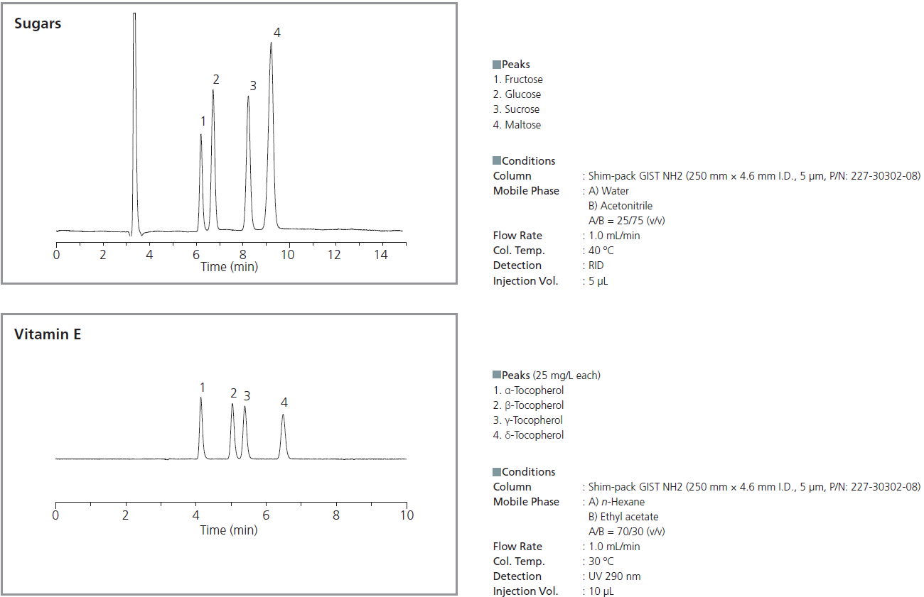 New high-purity porous spherical silica chemically bonded with the aminopropyl group ensures the superior stability of Shim-pack GIST NH2. It is capable of the analysis of vitamin E or simultaneous analysis of sugars that are hard to separate in reversed phase mode. In addition, due to being primarily amine-bound, Shim-pack GIST NH2 can analyze sugars with no separation of anomers, even under low-temperature conditions.