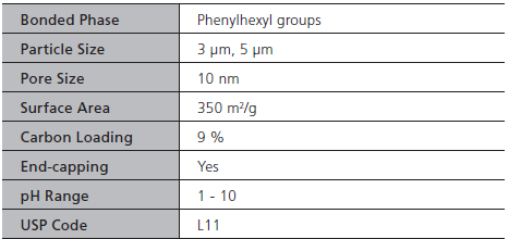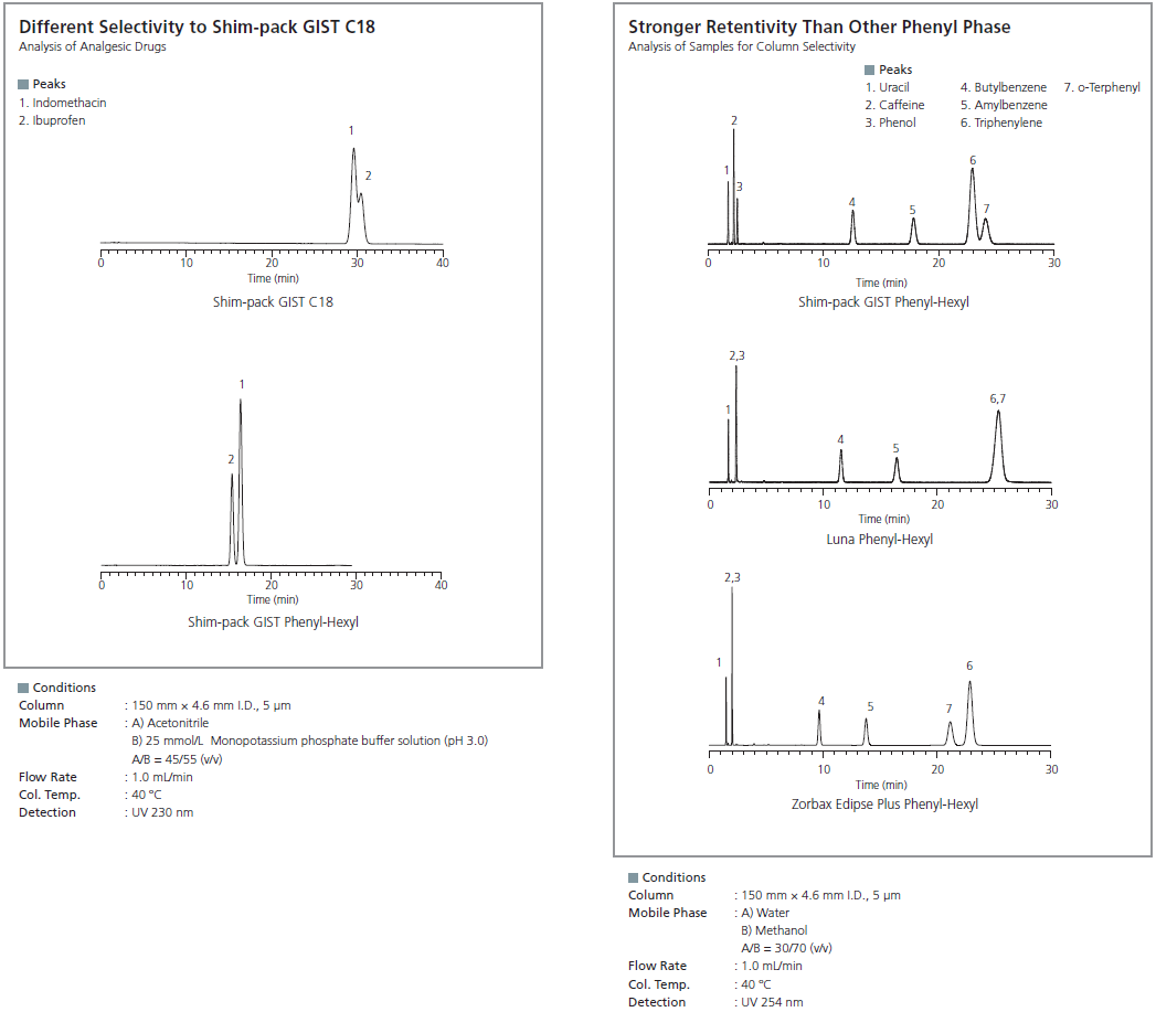 Shim-pack GIST Phenyl-Hexyl columns are bonded with a phenyl ring together with a hexyl (C6) chain, which provides complementary selectivity to straight alkyl-chain columns due to its π-π interactions and hydrophobic interactions. Furthermore, Shim-pack GIST Phenyl-Hexyl maintains the same ultra-high inertness, wide pH range and high durability as the Shim-pack GIST C18, achieving stronger retention than other phenyl columns as well as reducing or eliminating adsorption of polar compounds.