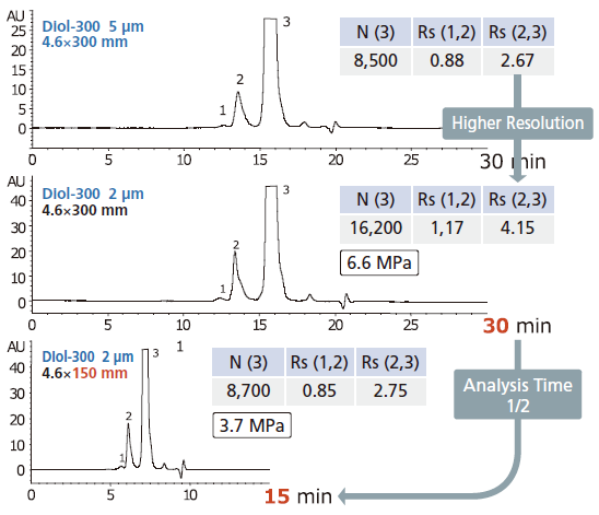 With different pore sizes, Shim-pack Bio Diol LC columns are effective for analysis of aggregates and fragments of mAb, oligonucleotides and carbohydrates. By reducing the particle size from 5μm to 2μm, the resolution between aggregates and monomers was greatly improved. Furthermore, by reducing the column length from 300mm to 150mm using a 2μm particle, 50% less run time was achieved, while maintaining resolution as compared to the original method that used a 5μm, 4.6 × 300mm column.