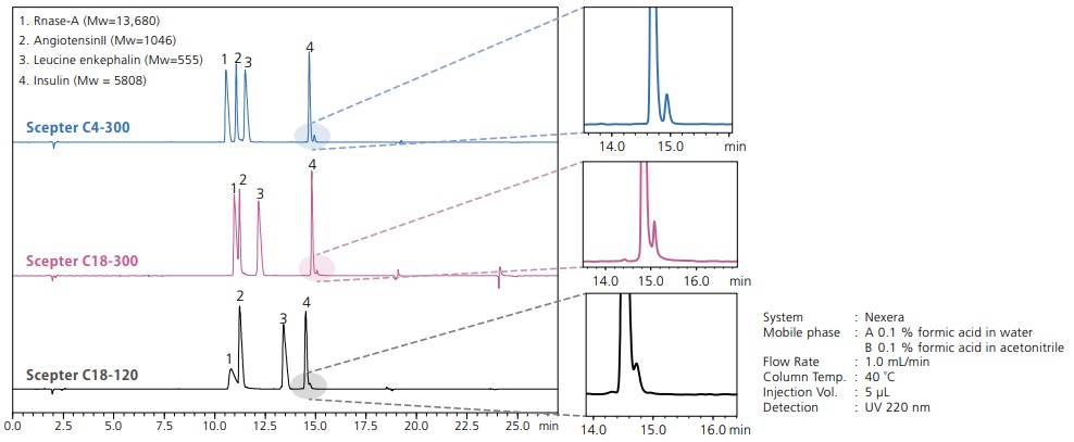 Shim-pack Scepter C18-300 and C4-300 made with 300 Å (30 nm) pore size packing material. The larger pore size is recommended for the analysis of mid-sized and large-sized molecules with molecular weights above 5000 to enable retention and avoid size-exclusion effects. This analysis of a mixed sample of four different peptides and proteins demonstrated good peak shapes and favorable separation of insulin and ribonuclease A due to the pore size that was large enough to allow proper diffusion of these large molecular weight compounds.
