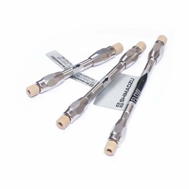 Shim-pack Scepter C18-300 is wide-pore organic silica hybrid reversed phase columns recommended for the separation of proteins such as monoclonal antibodies and mid-sized molecules such as oligonucleic acids and peptides that may not be retained on 100-120Å pore size columns due to size-exclusion effects. The organic silica hybrid base material is highly stable even at high temperatures under acidic and basic mobile phase conditions. Pore sizes are optimized for large molecular weight compounds and dispersed uniformly in the column, resulting in symmetrical peak shapes and increased resolution of antibodies and nucleic acids compared to a smaller pore size column. Shim-pack Scepter C18-300 is also effective for high-sensitivity LC/MS analysis, producing good peak shapes even under weak ionpairing conditions using a formic acid mobile phase.