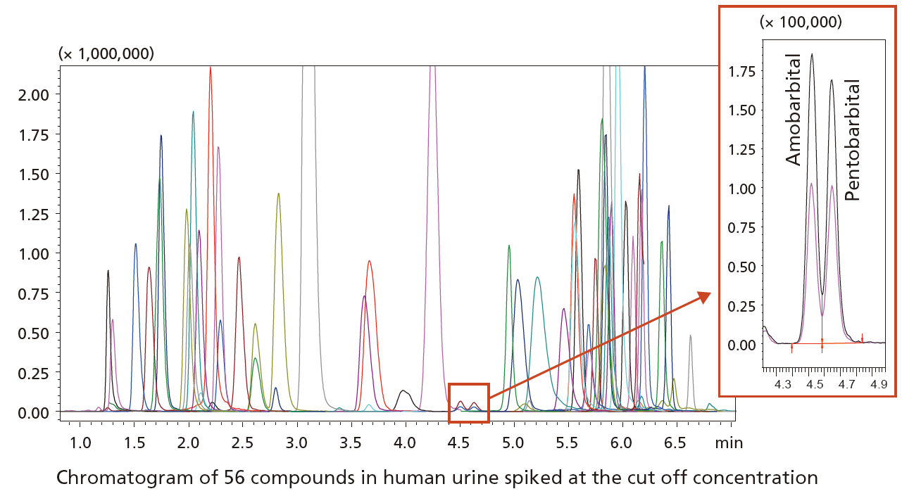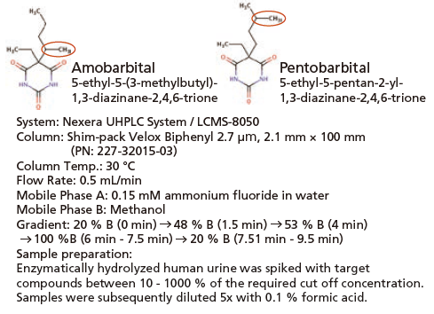 Even under the condition where 56 drugs of abuse and metabolites in human urine are quantitated within 10 minutes, two structural isomers, amobarmital and pentobarbital, which have been historically difficult to separate due to their similarity in chemical structures, could be relatively well resolved with Shim-pack Velox Biphenyl column.