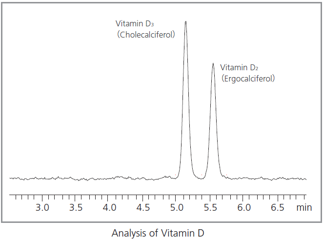 Vitamins D2 and D3 are difficult to separate by normal phase HPLC. To use the reverse phase mode, samples must be pretreated to remove especially fat-soluble contaminant components prior to analysis. Due to the compatibility of SFC with fat-soluble compounds, the time and trouble involved in pretreatment can be eliminated. If a UC-PyE column is used, the slight differences between vitamins D2 and D3 can be quickly separated based on differences in their mutual interaction with the pyrenylethyl group.