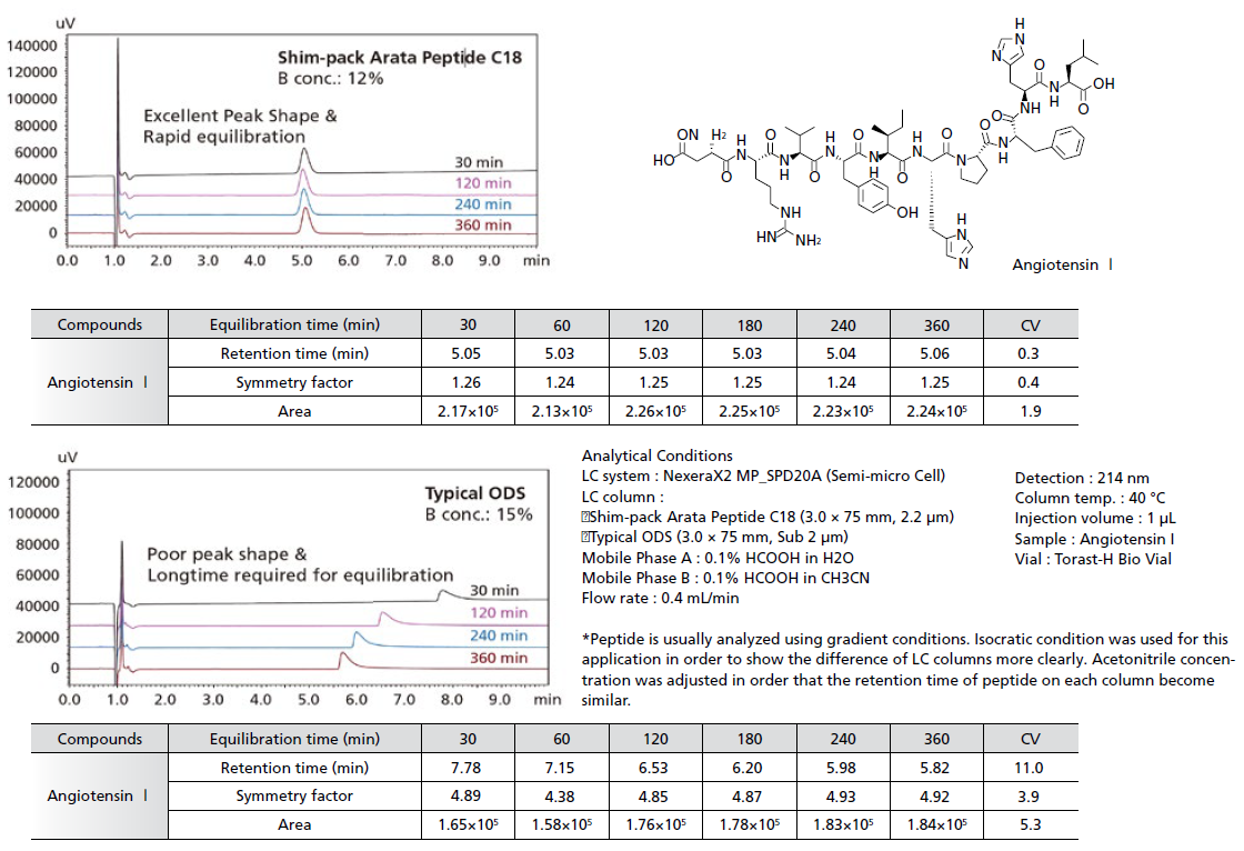 Both columns were new columns (shipping solvent: acetonitrile) and equilibrated with mobile phase without any conditioning. Angiotensin I was analyzed after a certain period of equilibration and retention time, symmetry factor and area of Angiotensin I were compared. The typical ODS showed poor peak symmetry and unstable retention time even after 360 minutes of equilibration. In contrast, Shim-pack Arata peptide C18 already showed stable retention after 30 minutes of equilibration and excellent peak shape was obtained.