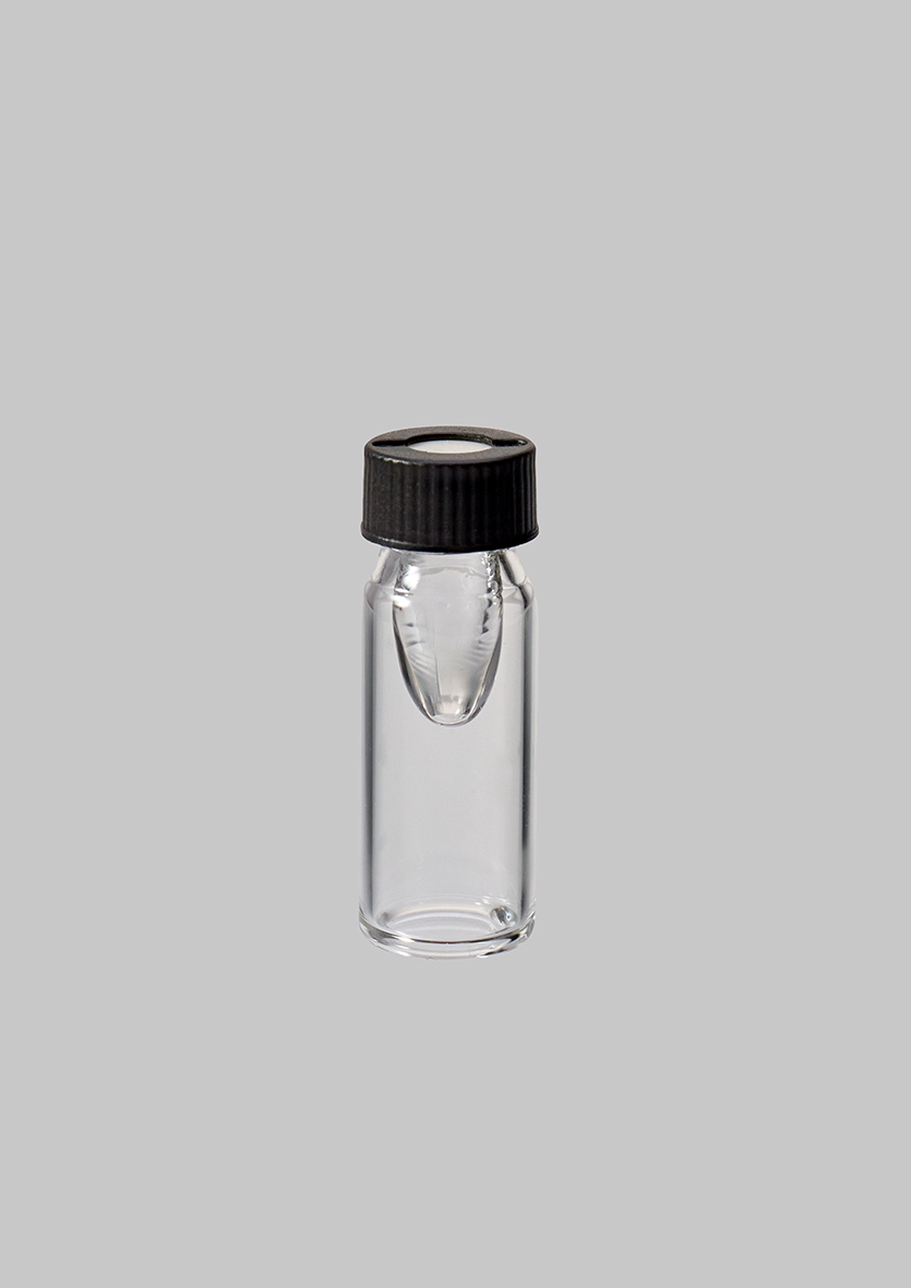 Our small-volume vials with their unique shape are made of the same materials and receive the same cleaning treatment as the 1.5 mL vials. They suppress adsorption more than other small-volume inserts by limiting the contact surface between the sample and the container. In addition, the bottom surface of the vial is hollowed out in order to increase thermal conductivity.