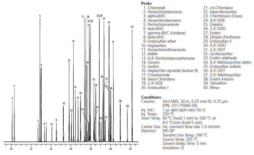 - General-purpose columns for semi-volatiles, phenols, amines, residual solvents, drugs of abuse, pesticides, PCB congeners (e.g., Aroclor mixes), solvent impurities.