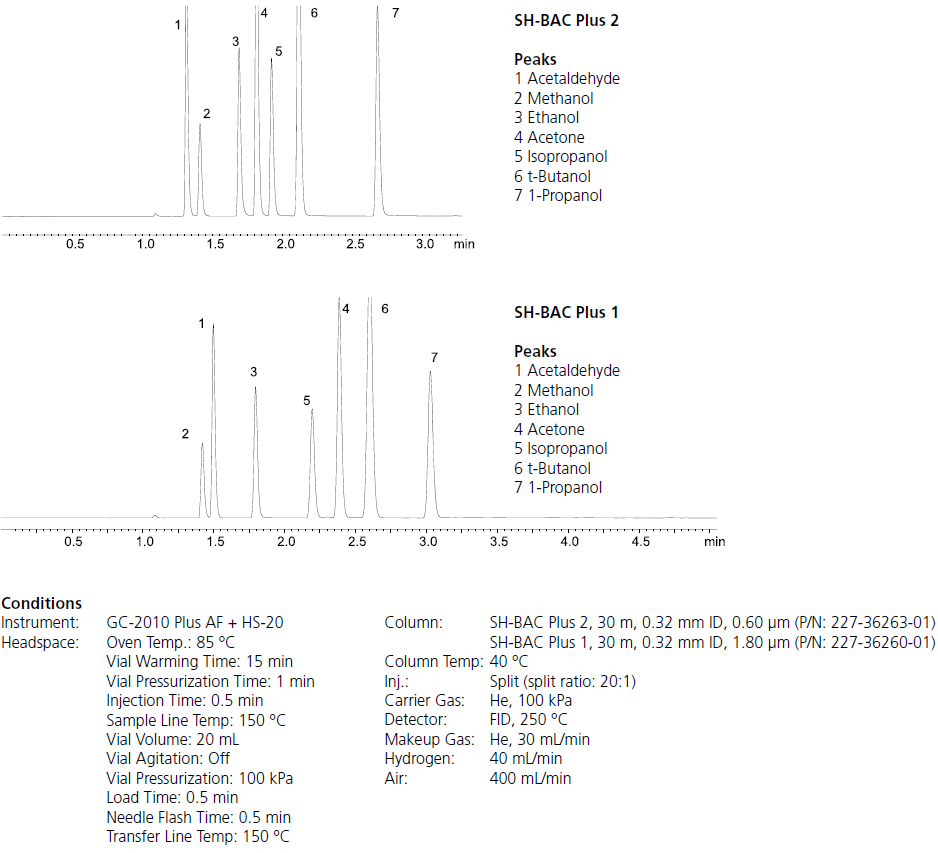- Optimized column selectivities guarantee resolution of ethanol, internal standards, and frequently encountered interferences.