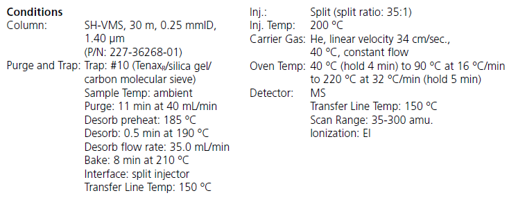 - Dedicated columns for analyzing volatile organic pollutants by GCMS including methods TO-15, TMS, and EPA 8260.