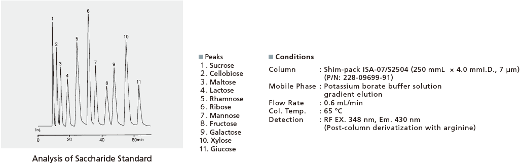 Shim-pack ISA/ISC series uses polystyrene gel as solid support, making it possible to utilize both electrostatic reaction and hydrophobic reaction. They are suitable for the analysis of sugars (ISA) and guanidiono compounds (ISC-05).