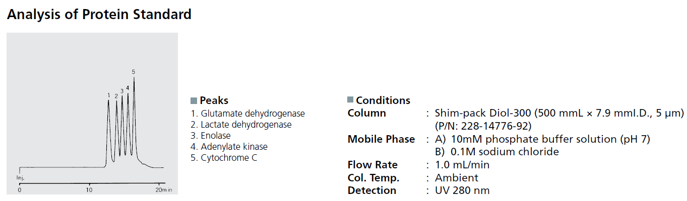 Shim-pack Diol series is packed with porous spherical silica gel chemically bonded with a hydroxyl group. Due to the hydrophilic hydroxyl group, Shim-pack Diol series can be used in high-speed GFC and provide sharp peaks during the analysis of protein and biochemicals (such as enzymes).