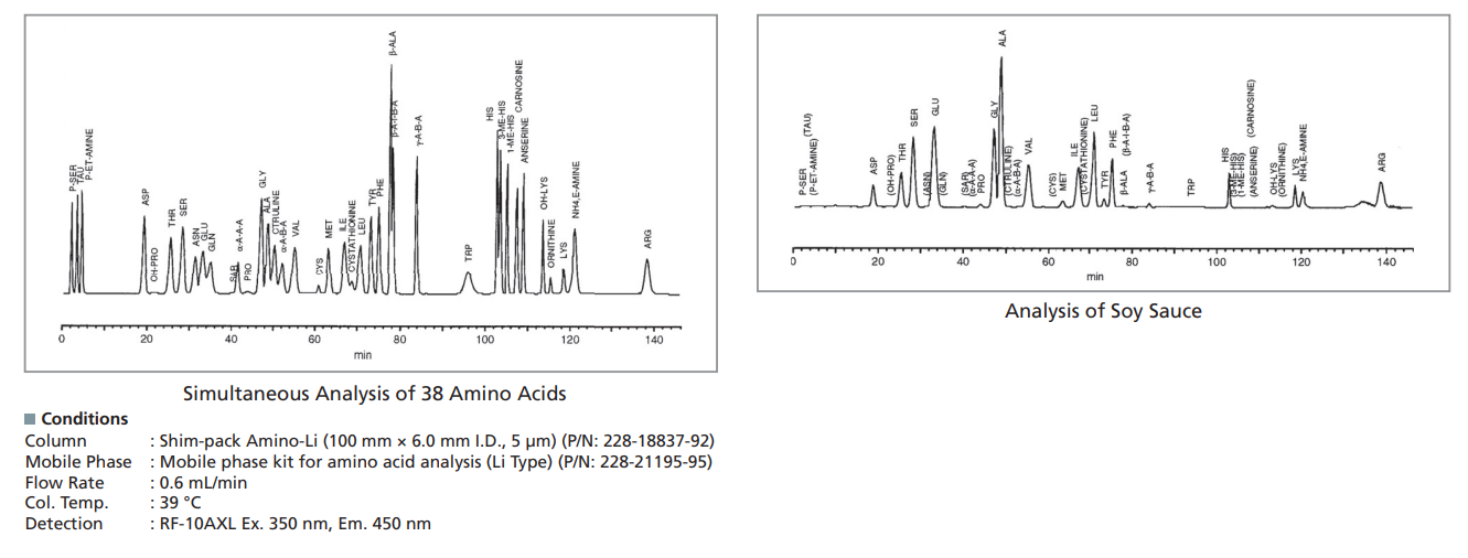 Shim-pack Amino series uses polystyrene gel as solid support, making it possible to utilize both electrostatic reaction and hydrophobic reaction. It is ideal for the analysis of amino acids.