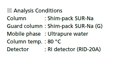 The Shim-pack SUR-Na column can be used with a simple HPLC configuration because the mobile phase is pure water. The refractive index detector, RID-20A, is one of the most popular detectors to be adopted in combination with this column. The maximum pressure of the column is 4 MPa, allowing the system to be configured with the Nexera lite model.