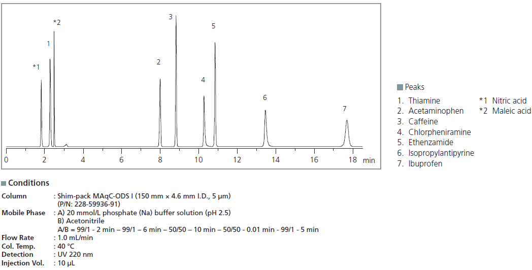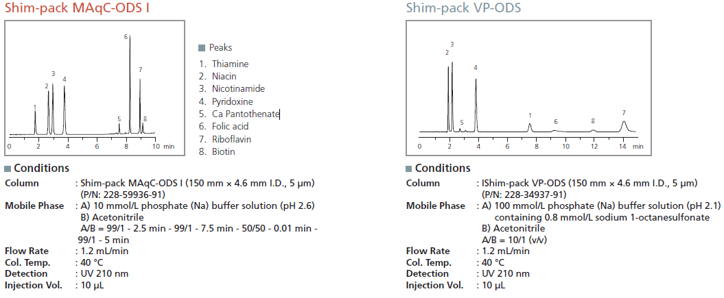 Shim-pack MAqC-ODS I reversed-phase columns are packed with a silica gel containing metal and bonded octadecylsilyl group. In addition to the hydrophobic characteristics of the ODS, the metal content also provides cation-exchange effects. This increases the retention of basic compounds. Therefore, this allows use with only a buffer solution as the mobile phase for analyses that previously required using an ion pair reagent and enables using gradient elution. These characteristics are especially beneficial for analyzing water soluble vitamins and pharmaceuticals that contain a large amount of basic compounds.