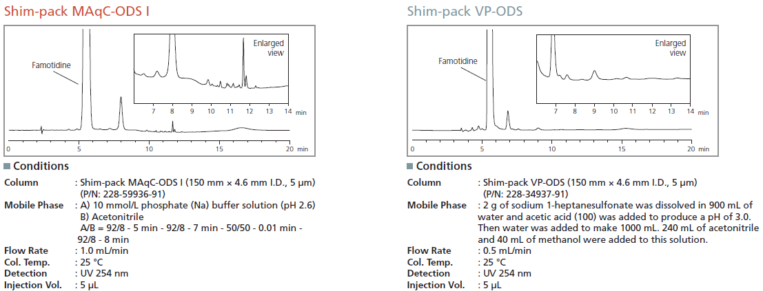 Many pharmaceuticals are basic compounds. The majority of impurities in pharmaceuticals, such as unreacted ingredients, by-products, and decomposition products, are highly polar basic substances. Consequently, analyzing impurity peaks using LC/MS can be difficult if a non-volatile ion pair reagent is contained. In the case of the mobile phase used for famotidine analysis with Shim-pack MAqC-ODS I, LC/MS analysis is also possible by desalting the mobile phase using an automatic pretreatment system such as Co-Sense for LC/MS. While a typical ODS column (Shim-pack VP-ODS) detects 12 types of impurities, the Shim-pack MAqC-ODS I detects 20 types of impurities due to separation specificity and gradient elution.