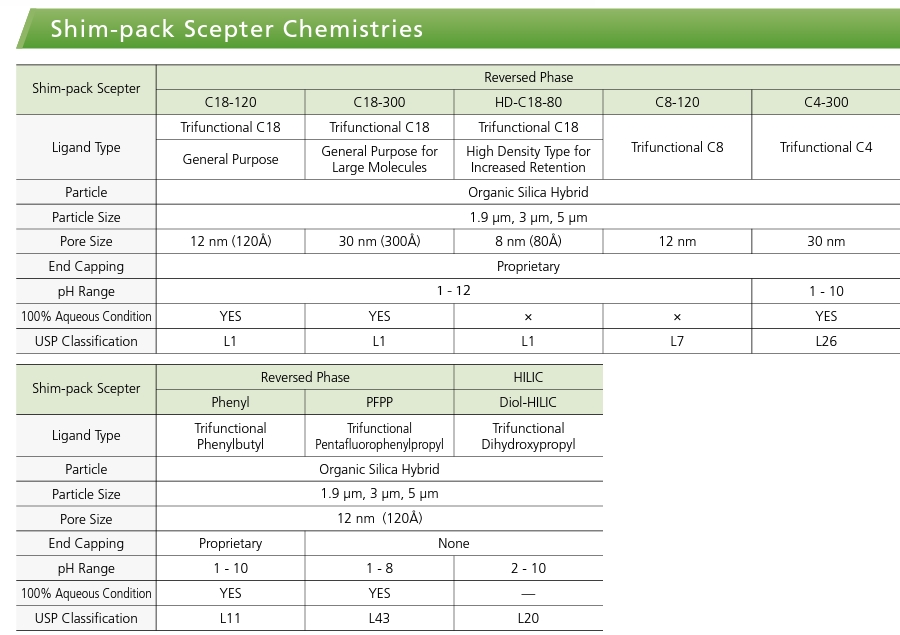 Achieve excellent stability and performance over a wide range of LC conditions with Shim-pack Scepter™- the next generation organic silica hydrid-based LC columns. Featuring different ligand functional groups, Shim-pack Scepter columns are effective for method development/scouting, and are suitable for a wide variety of applications and sample types. The three particle sizes (1.9 µm, 3 µm, 5 µm) and wide range of column dimensions make Shim-pack Scepter LC columns fully scalable between UHPLC, HPLC, and preparative LC for seamless method transfer between different laboratory instrumentation.