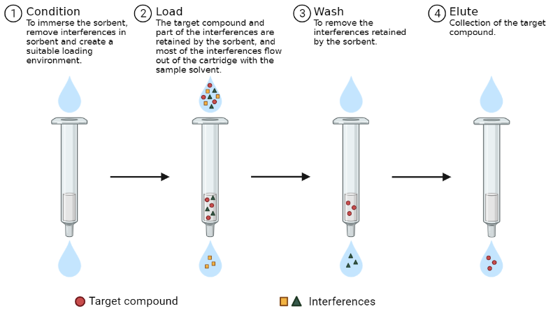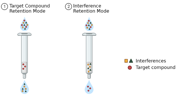The purification mechanism of SPE method can be divided into two modes including target compound retention mode and interference retention mode.